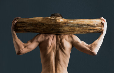 Fit strong man lifting a log in a forest, close up view on his hands, chest and arm muscles showing off his muscular physique