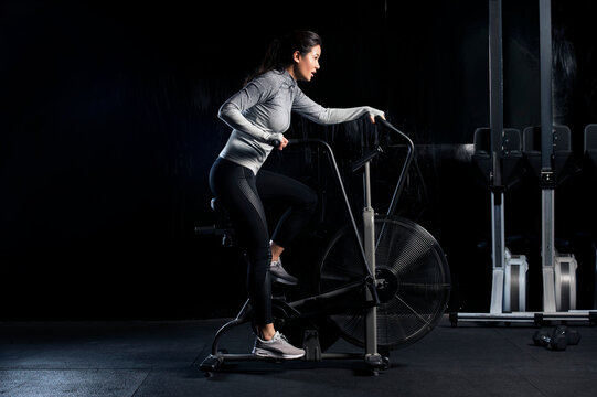 Tilt up shot of sporty man wearing VR headset when training on fitness bike at home
