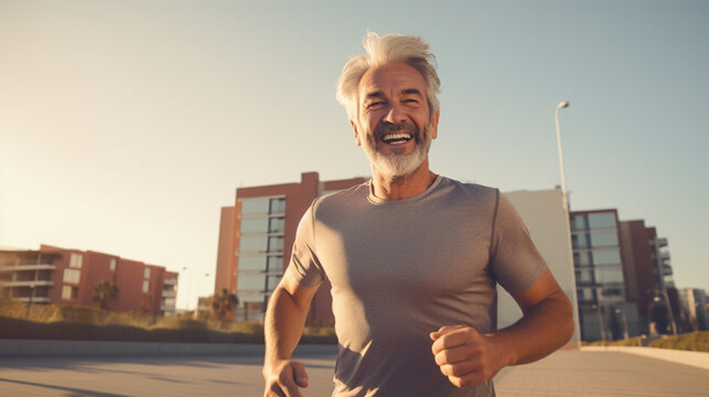An older man jogging in the morning in the city