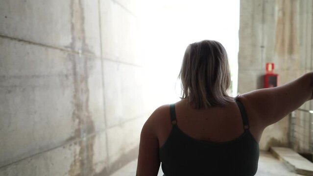 Smiling and curvy young woman doing exercises with dumbbells, during weight loss training. Active athlete and exercise routine to lose weight.