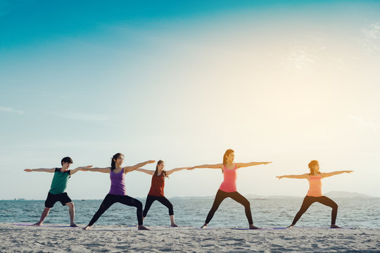 Young group man and woman yoga practice on mat relaxation in class exercise with pose fitness sport for healthy on the beach and seaside  modern city at sunrise relax