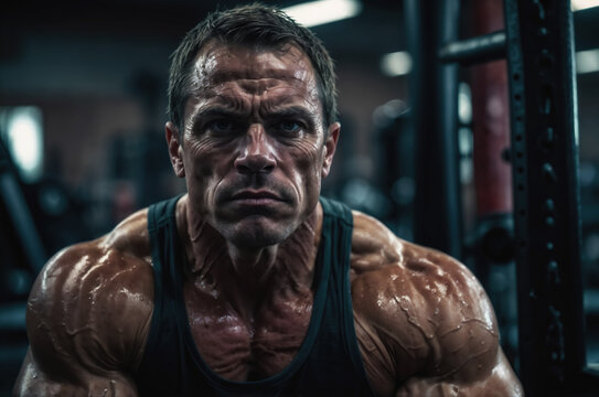 Muscular bodybuilder posing, showing his muscles after workout session