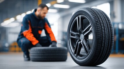 Automotive technician in blue and orange coveralls is changing tires in a well-lit garage, showcasing the tire replacement process with tools and equipment nearby