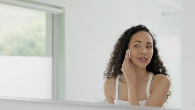 Woman, beauty and cotton pad in mirror for face cleaning, makeup removal or cleanse in bathroom at home. Happy female wiping cosmetic product with swab for dermatology, facial treatment or exfoliate