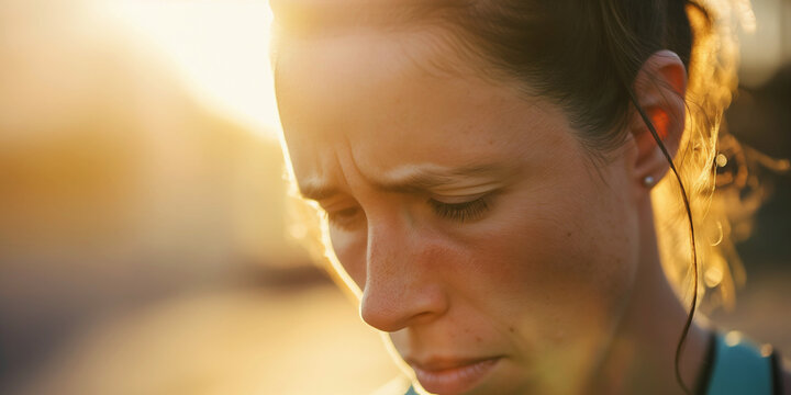 Lifestyle portrait of woman athlete, exhausted and disappointed after losing running marathon