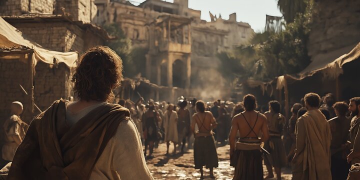 Biblical Illustration: Fall of Jerusalem, Babylonians Destroy, Temple Burns, Exile, Beige Background, Copyspace