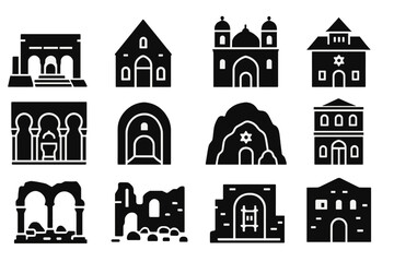 Historic Synagogue Icons. Solid style icons of historic synagogues: ancient Jerusalem synagogue, medieval European shul, Spanish