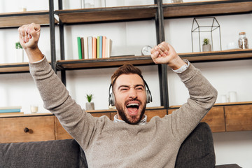 Surprised and exited cute baby with headphones listening to music with room for copy