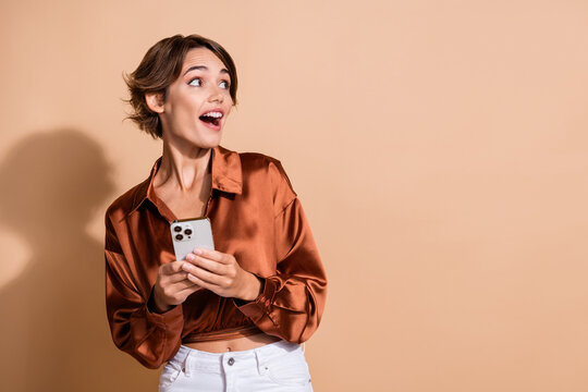 Photo of dreamy exited girl wear brown blouse communicating modern gadget looking empty space isolated beige color background