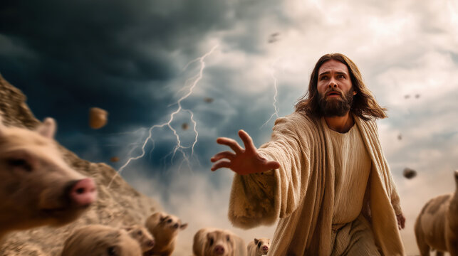Storm clouds swirl over the lake as Jesus stands with arm outstretched. A herd of pigs shrieks and dives from the cliff. Behind Him, the healed man kneels, clothes torn, his eyes now calm and clear...