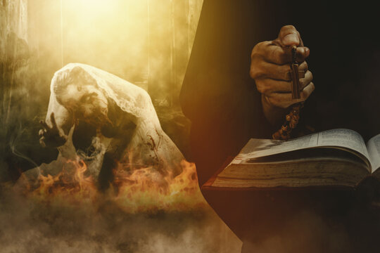 exorcist woman is reading bible and holding rosary beads, closeup of hands in dark room