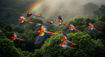 Scarlet macaws flying over rainforest with rainbow in background