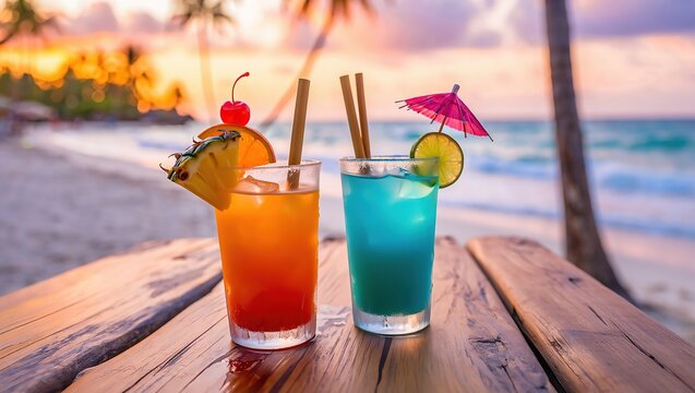 cocktail on a beach cafe table on a tropical island during sun set,  Created using generative AI tools.