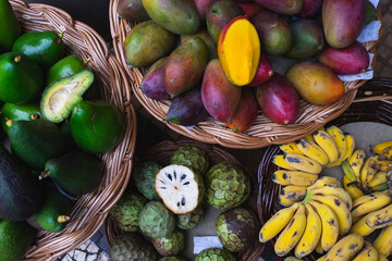 Juicy exotic fruits close up. Pineapple, papaya, mango, gragon fruit on table ready to eat