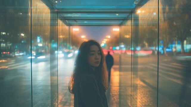 Irritated angry Asian Caucasian schoolgirl kid waiting in city annoyed teen teenager child checking time at wristwatch late evening neon impatient punctual young junior girl wait for friend meeting