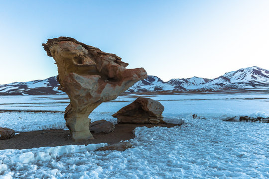 Eduardo Avaroa National Park - July 18, 2017: The famous Stone Tree in Eduardo Avaroa National Park, Bolivia