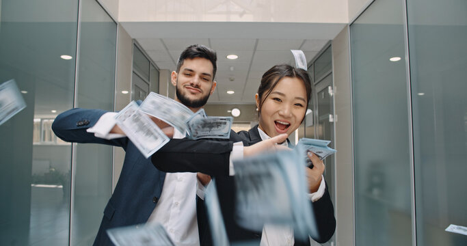 Two interracial business people standing in office hall with arrogant faces, throwing money in air, celebrating their success - way to success concept