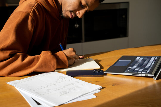 Focused millennial woman in eyewear writes out information from invoices, calculating monthly expenses alone at home. Young lady managing incomes and outcomes, planning investments or summer vacation.