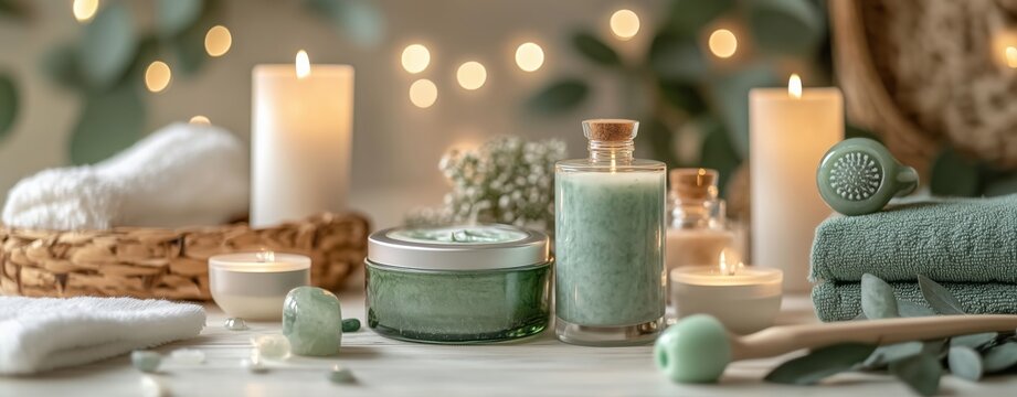 Luxury Spa Skincare Relaxing spa setup with candles and green products. Luxury spa skincare relaxation setup with organic face masks, jade rollers, and aromatherapy candles in soft lighting
