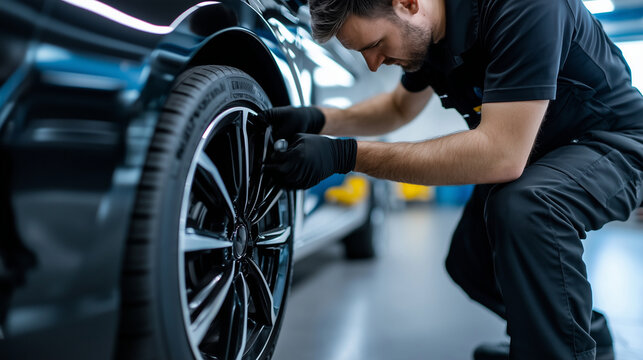 A close-up of a technician balancing a car’s new summer tire, ensuring a smooth ride after replacing the winter tire. The clean, well-lit garage setting provides a professional bac