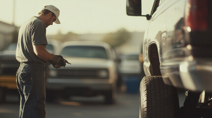 Focused mechanic inspecting tire for automotive services promotion