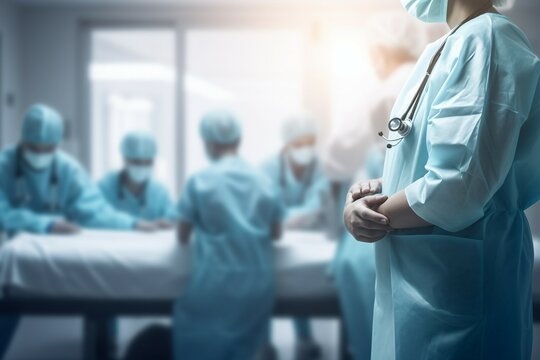 Surgeon and anesthetist doctor ER surgical team with medical clinic room background for emergency nursing care professional teamwork and patient trust in ICU hospital's hospitality concept