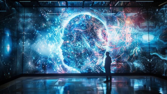 A man contemplating the future of virtual reality in a futuristic neon lit interactive exhibit showcasing technological innovation and immersive