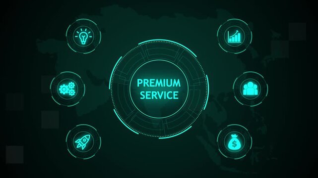 Premium Service, Hologram Futuristic Interface, Business, Technology, Internet and network concept. Digital world map technology background.