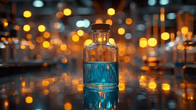 A clear glass bottle filled with a teal liquid, set against a blurred laboratory backdrop of glassware and glowing lights