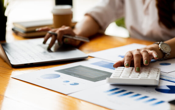 Expert woman asian female people review data number costing managerial account prepare monthly actual cost variance report at tax audit office. ESG sheet budget control ERP process service project.
