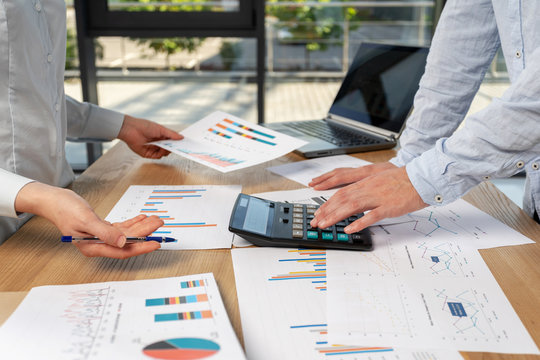 Cropped profile side view two unit clever intelligent expert person in formalwear stand vs behind desk in light loft interior workplace check corporate invoice bills on calculator