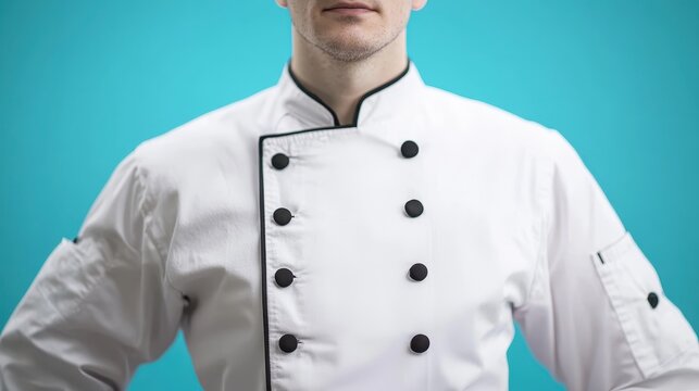 Professional chef in a clean white uniform posing confidently against a vibrant turquoise background, showcasing culinary skills and dedication to the art of cooking