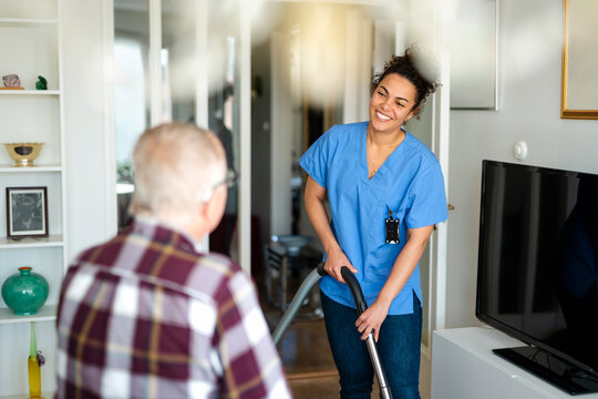 Smiling female healthcare expert holding vacuum cleaner talking with senior man at home