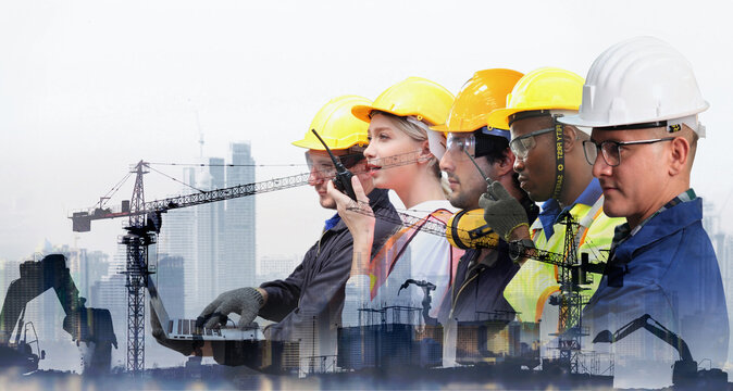 Civil engineer teams meeting working together wear worker helmets hardhat on construction site in modern city. Foreman industry project manager engineer teamwork. Asian industry professional team