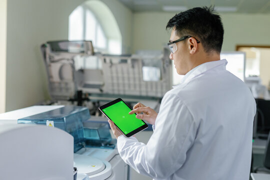 Technician Monitoring Power Grid Data on Computer Screen in Control Room with High-Visibility Safety Vest