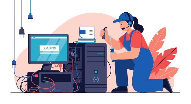 Illustration of a technician repairing a computer system, showcasing technology maintenance and hardware expertise for a modern and efficient