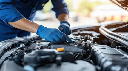 Mechanic Checks Car Engine Repair in Garage with Blue Gloves and Uniform Job.