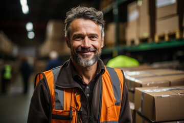 Smiling female airport worker in safety vest, glasses, near aircraft. Woman aviation expert working on plane. Technician, engineer, crew member in hangar. Aviation industry, airline transportation,