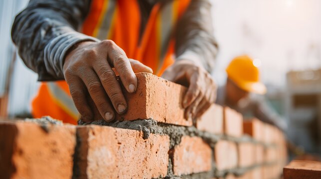 Industrial bricklayer working with cement to build a new brick wall