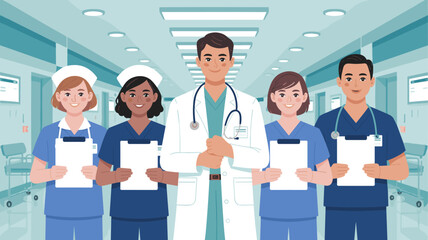 Diverse team of doctors and nurses standing in hospital hallway holding clipboards professional healthcare providers in modern clinic setting medical staff for presentations online advertising campaig