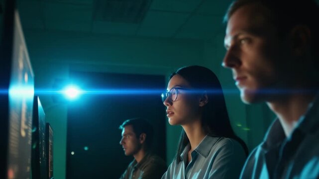 Focused professionals working with advanced technology in a dimly lit office. 4k Video footage