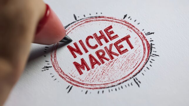 A hand is drawing a red circular stamp with the words "Niche Market" written inside, symbolizing targeted marketing strategies.