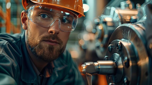Focused technician in hard hat and safety glasses meticulously services machinery, embodying expertise at an industrial plant