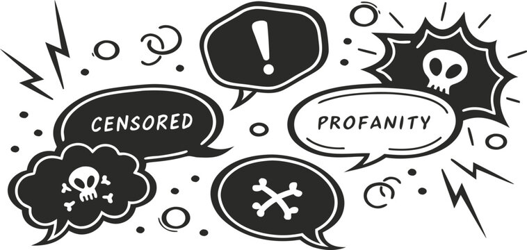 Comic swear speech bubbles. Hate angry talk, aggressive expletive curse. Vector set of clouds with expressive typography symbols. Black dialogue boxes convey intense emotions, aggression and profanity