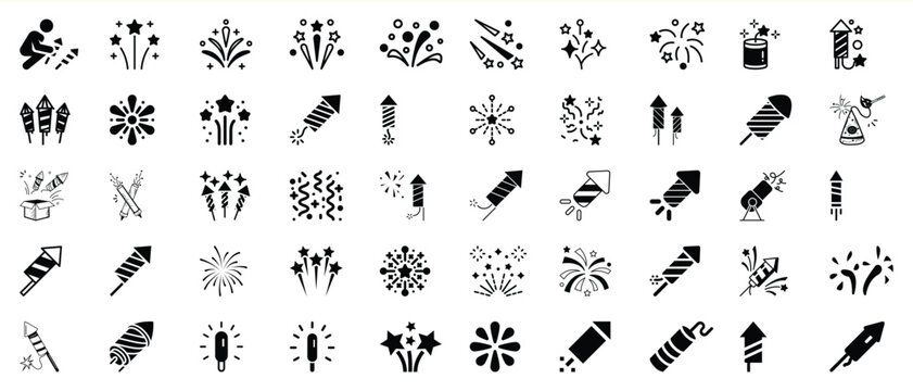 Fireworks icon collection. Set of firework, firecracker, confetti icons. Fireworks, sparkler, salute, petard, firecracker icons. Celebration and holiday icons