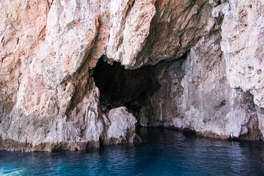 Natural sea cave with dark opening and clear blue water. Tranquil grotto for exploring. Outdoor adventure and marine travel concept.