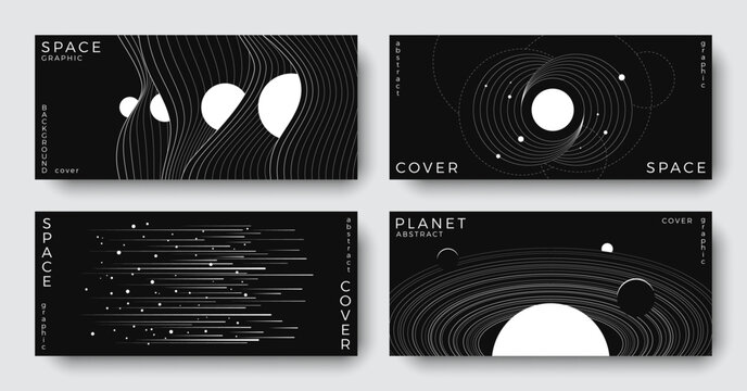 Set of abstract space astronomy horizontal backgrounds. Linear galaxy, planet, solar system. Black and white science future concept. Cosmic minimal design for cover, poster, banner, flyer, brochure