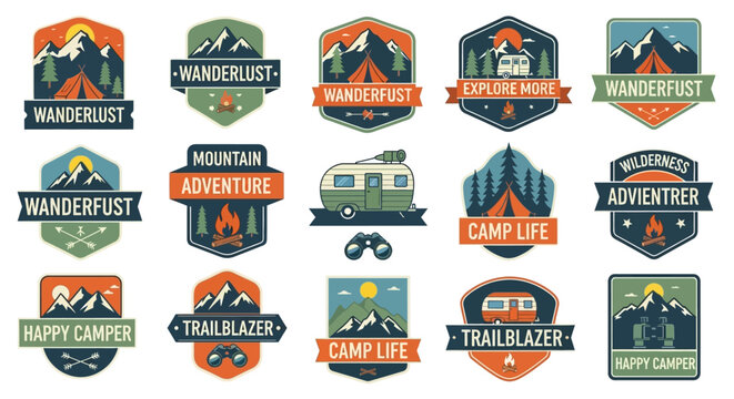 Adventure themed badges and emblems for camping, hiking, and nature exploration