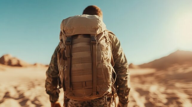 An evocative image of a soldier carrying a heavy backpack traversing a sunlit desert landscape, embodying resilience and the harsh realities faced during service.