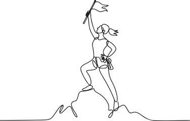 Single one line drawing woman climber standing on top of mountain with flag.one line  vector illustration  with out background